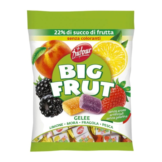 - Rozkoszuj się naturalnym smakiem owoców z żelkami Dufour Big Frut Mix - pysznymi, miękkimi galaretkami stworzonymi na bazie 22% soku owocowego. Wegańska receptura bez żelatyny, bez sztucznych barwników i bez sztucznych aromatów sprawia, że to idealna słodka przekąska dla całej rodziny.